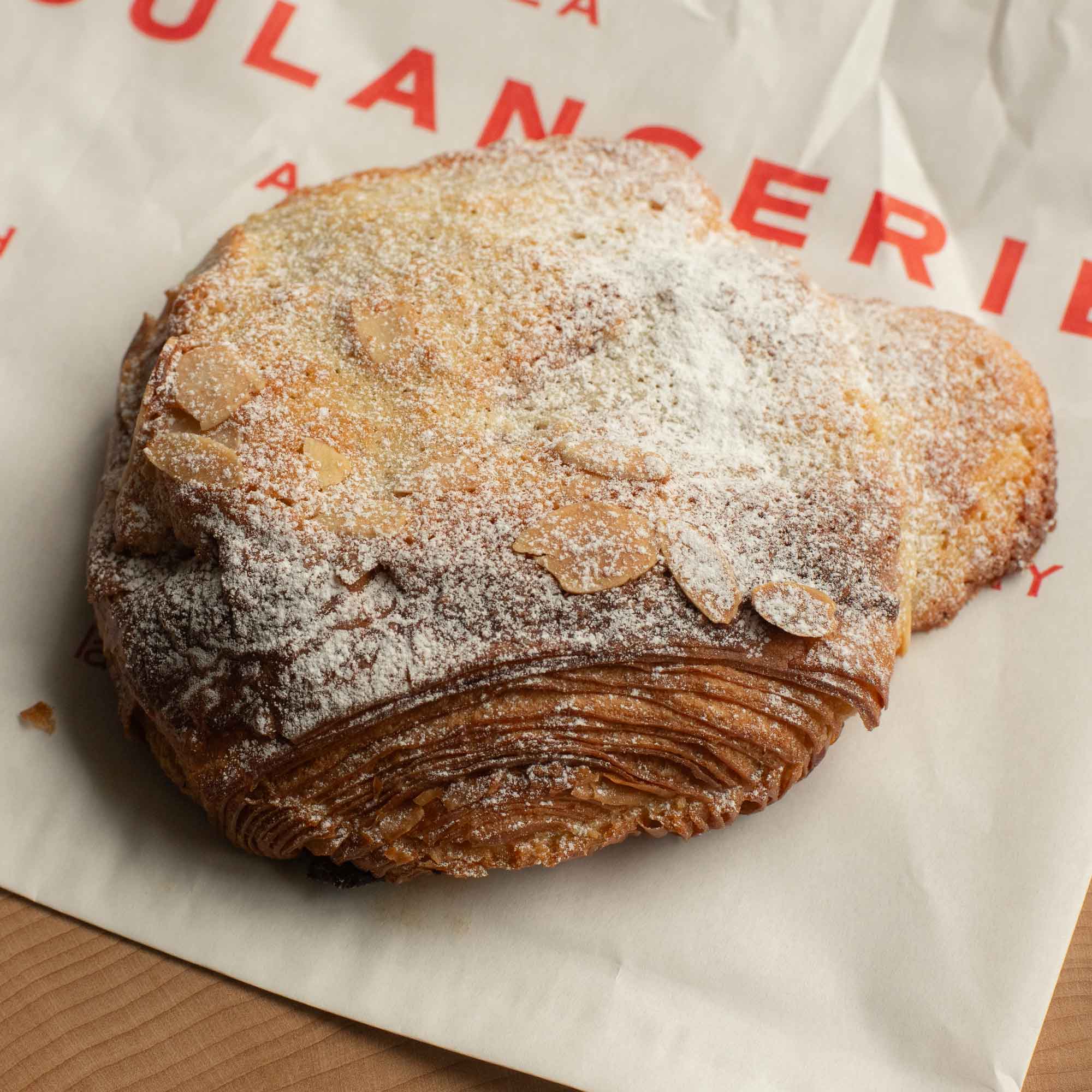 A buttery, flaky pastry filled with rich chocolate and topped with toasted almonds. Each bite offers a delightful crunch from the almonds and a smooth, creamy chocolate center.